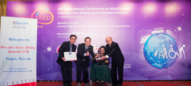 Prof. Dr. Chong Wey Lin (second from left), Founder and CEO,  along with Mr. Jack Chen, Vice CEO, OurCityLove Social Enterprise Co. Ltd., Taiwan, receiving Svayam Accessibility Award 2018 from Svayam Founder Ms. Sminu Jindal & Mr. Patrick Yey (extreme right), Hony. Chairman, TRANSED2018, at Taipei on 14 Nov 2018 on the sidelines of 15th International Conference on Mobility and Transport for Elderly and Disabled Persons (TRANSED2018)
