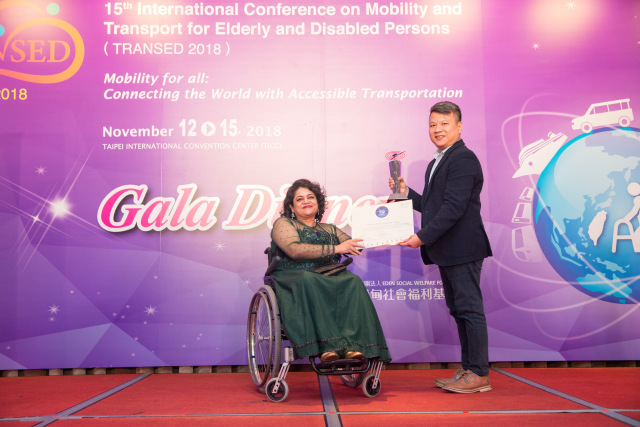Mr. Juo-Sung HUANG, CEO, Eden Social Welfare Foundation, Taiwan, receiving Svayam Accessibility Award 2018 from Svayam Founder Ms. Sminu Jindal at Taipei on 14 Nov 2018 on the sidelines of 15thInternational Conference on Mobility and Transport for Elderly and Disabled Persons (TRANSED2018)