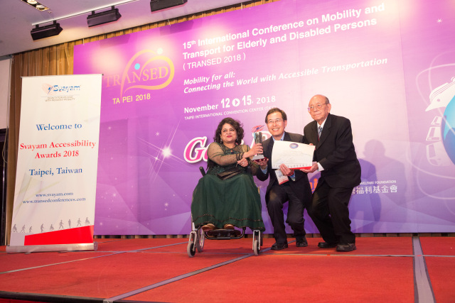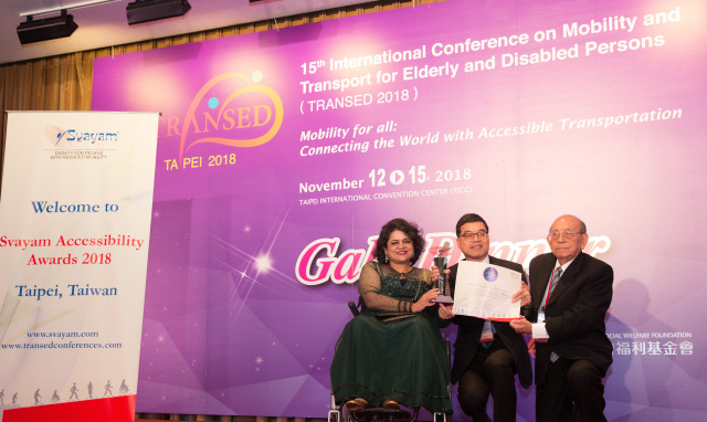 Mr. Hui-Sheng, Feng, (Centre) Deputy Director, Transportation Bureau, Taichung City Government, Taiwan, receiving Svayam Accessibility Award 2018 from Svayam Founder Ms. Sminu Jindal & Mr. Patrick Yey, Hony. Chairman, TRANSED2018, at Taipei on 14 Nov 2018 on the sidelines of 15th International Conference on Mobility and Transport for Elderly and Disabled Persons (TRANSED2018)